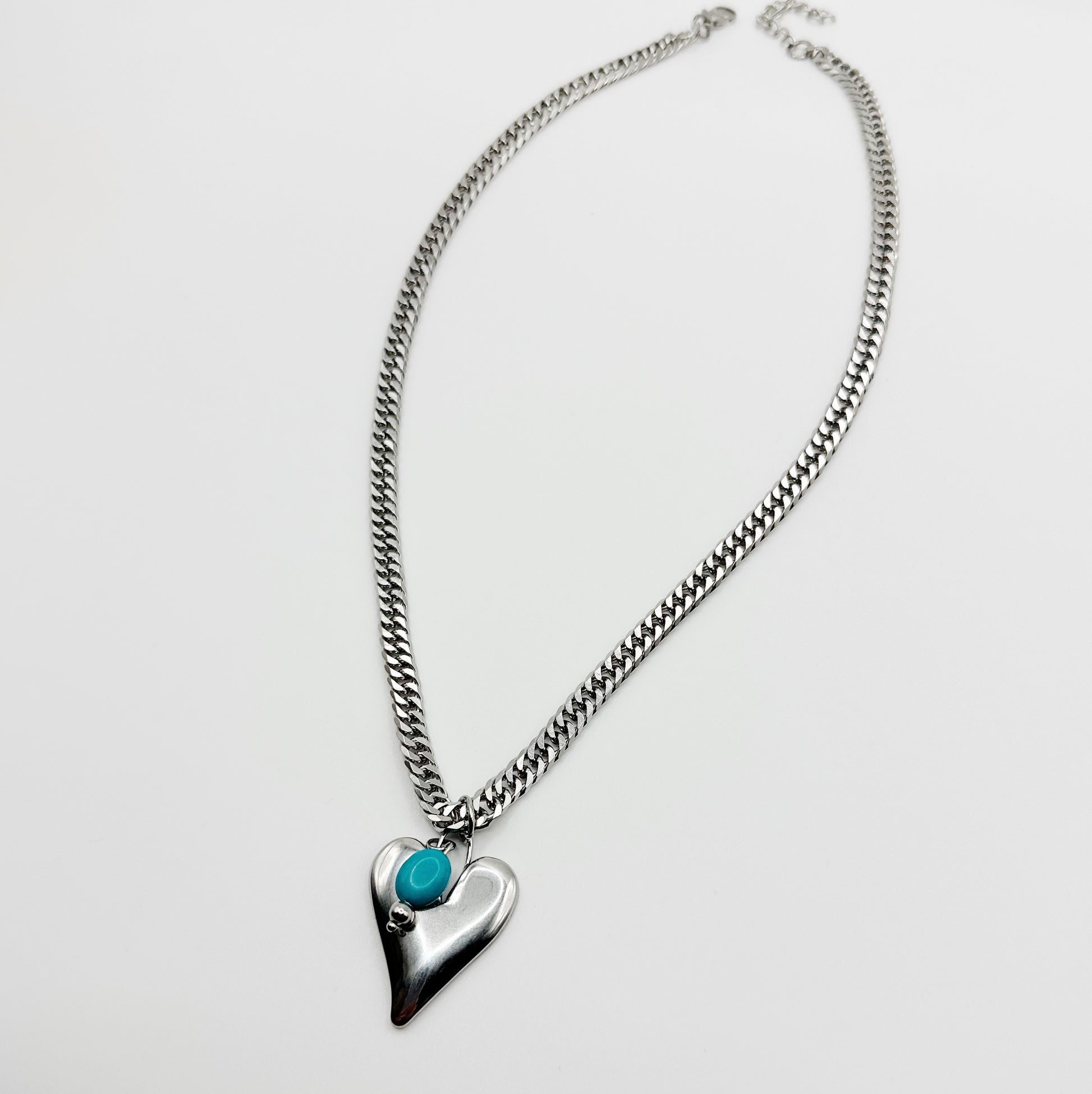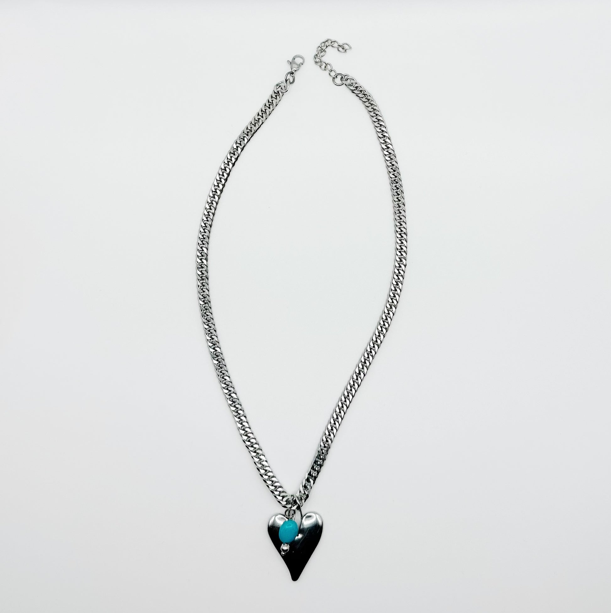 Collar de acero inoxidable y colgante de turquesa, mide 44 cm y tiene una cadena de extensión.