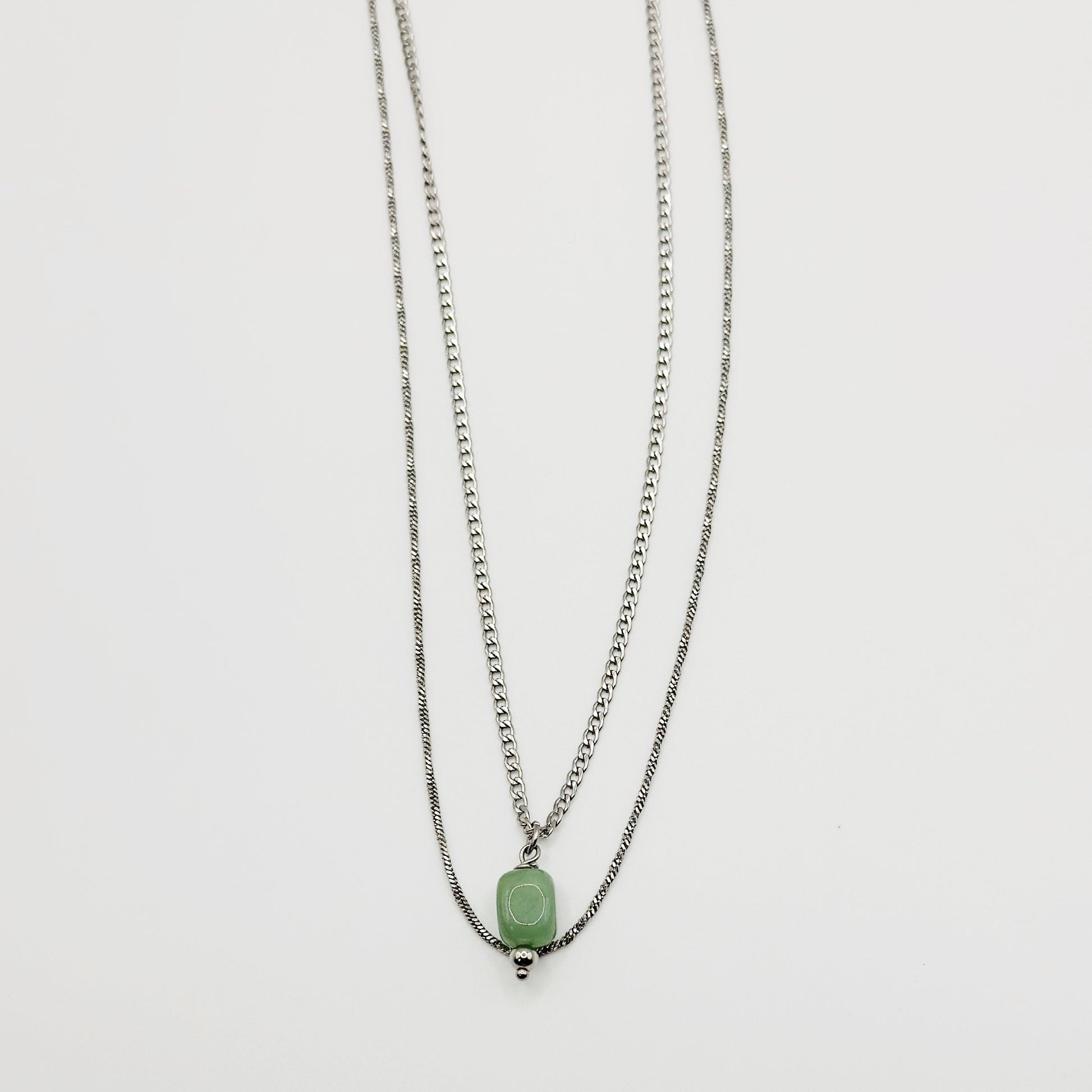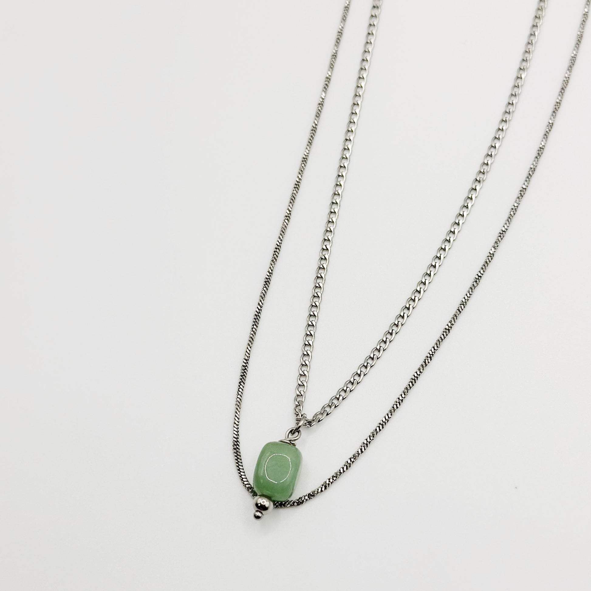 Collar doble de acero inoxidable, con dije de piedra Jade color verde.