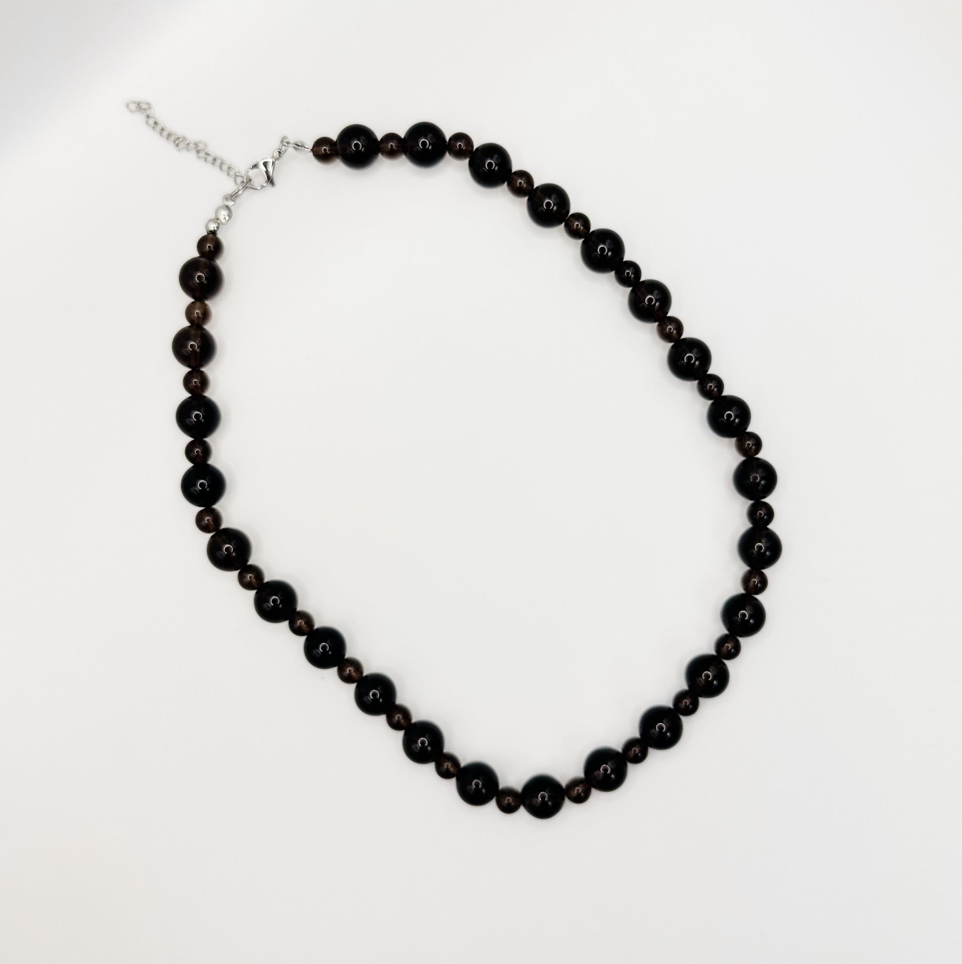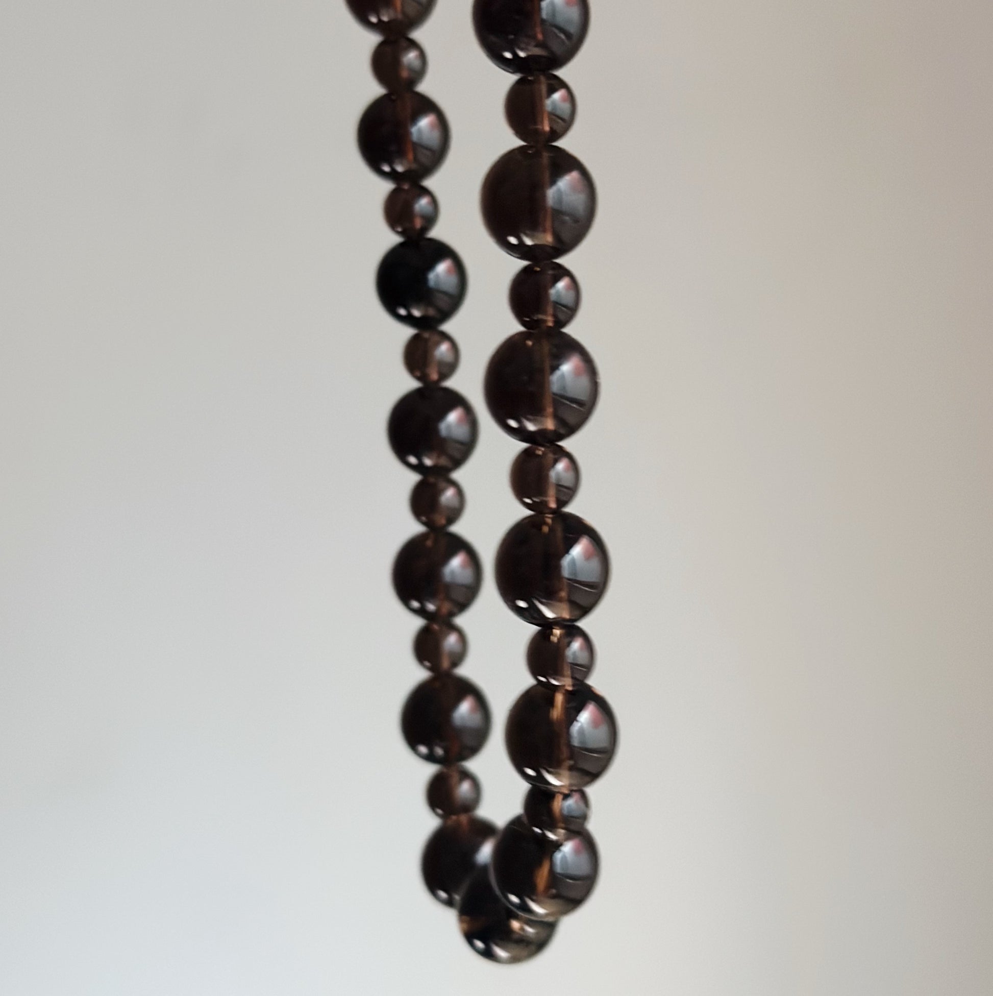 Collar de cuarzo ahumado, diseño con medidas de 10 mm y 6 mm. Mide 40 cm y tiene un broche y cadena de extensión de acero inoxidable.