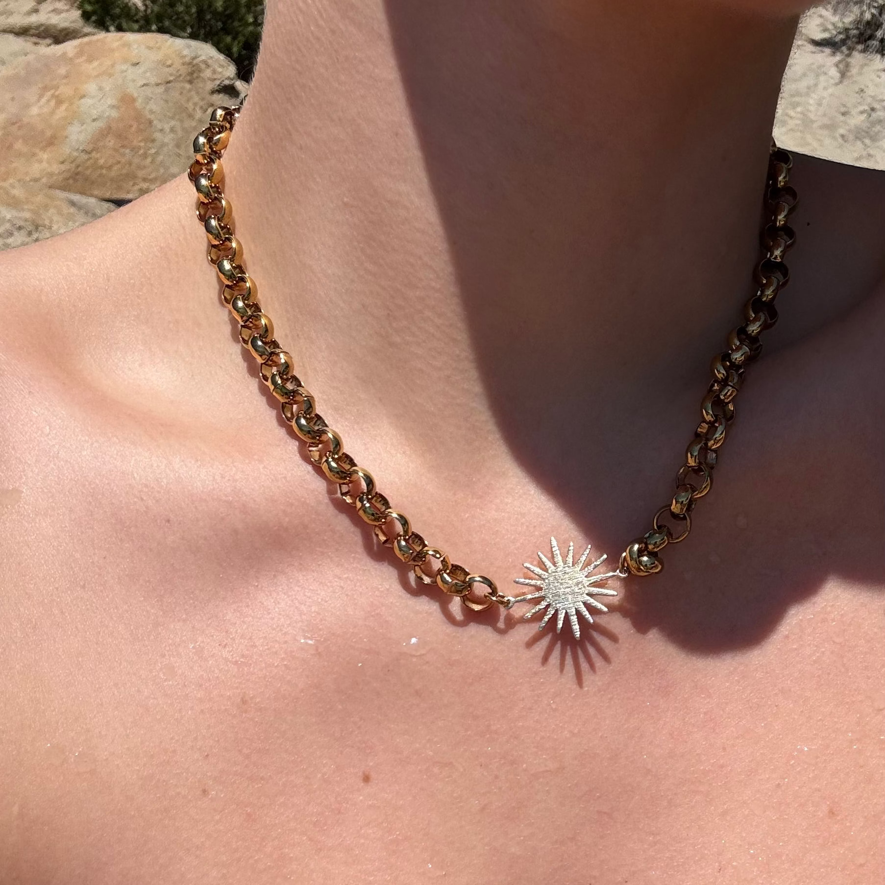 Collar de acero inoxidable, mide 43 cm y tiene una cadena de extensión. Lo puedes ajustar tipo choker por su eslabón amplio.
