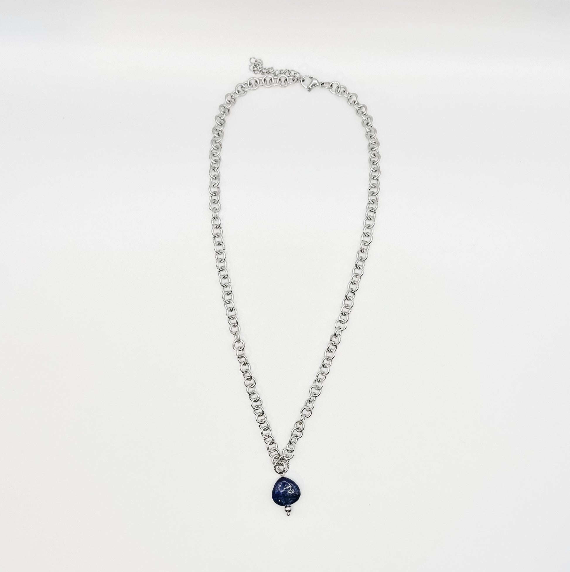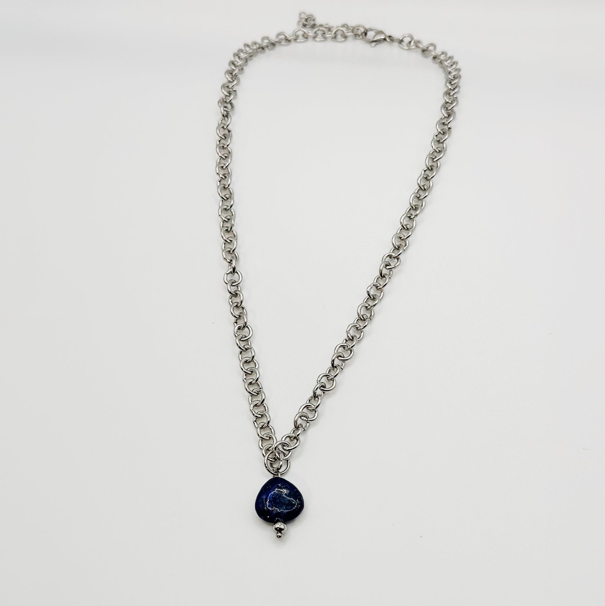 Cadena de acero inoxidable de 44 cm con cadena de extensión ajustable. Como dije tiene una piedra de lapislázuli de 14mm que destaca por sus intensos azules, creando una pieza única.