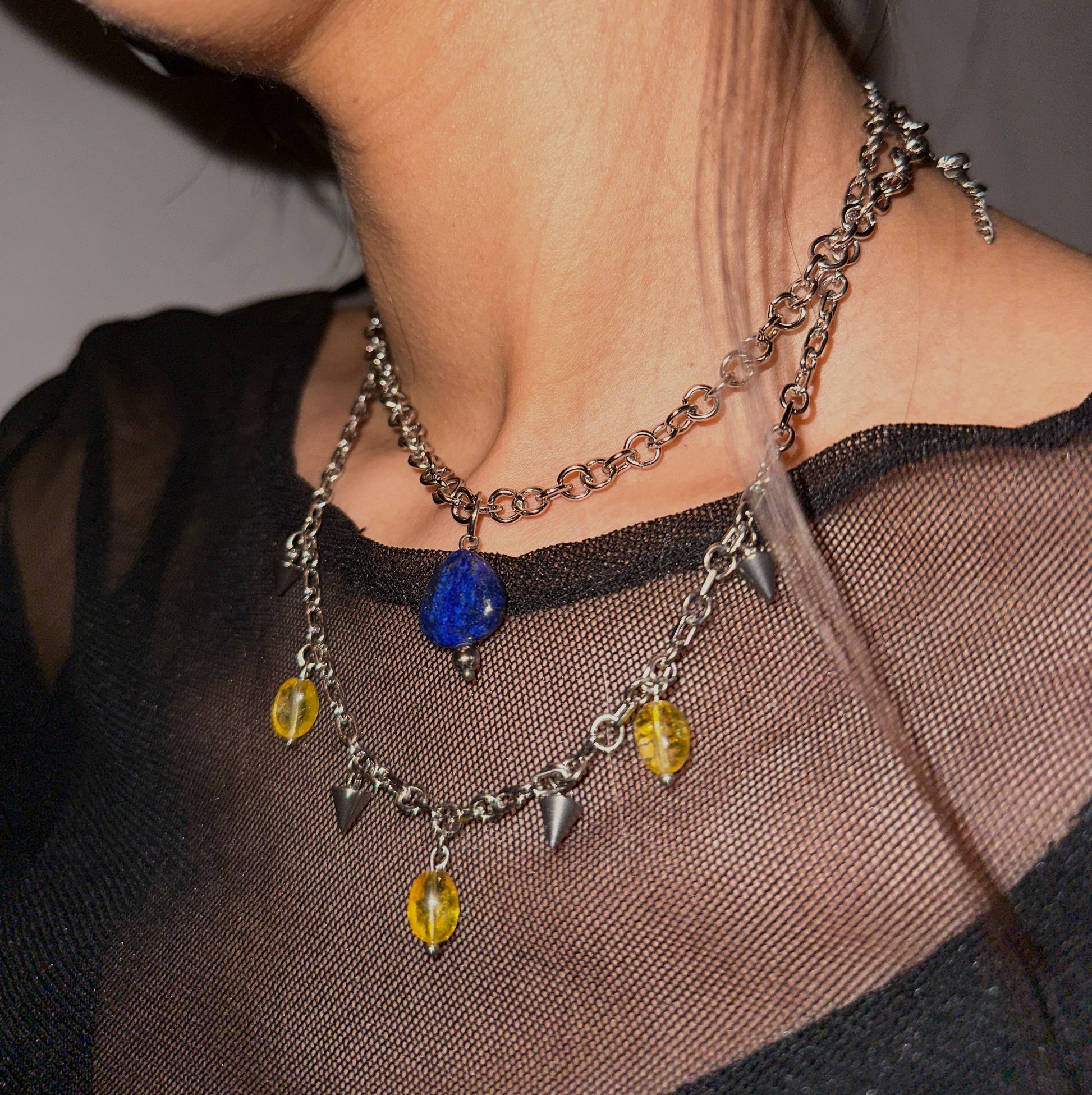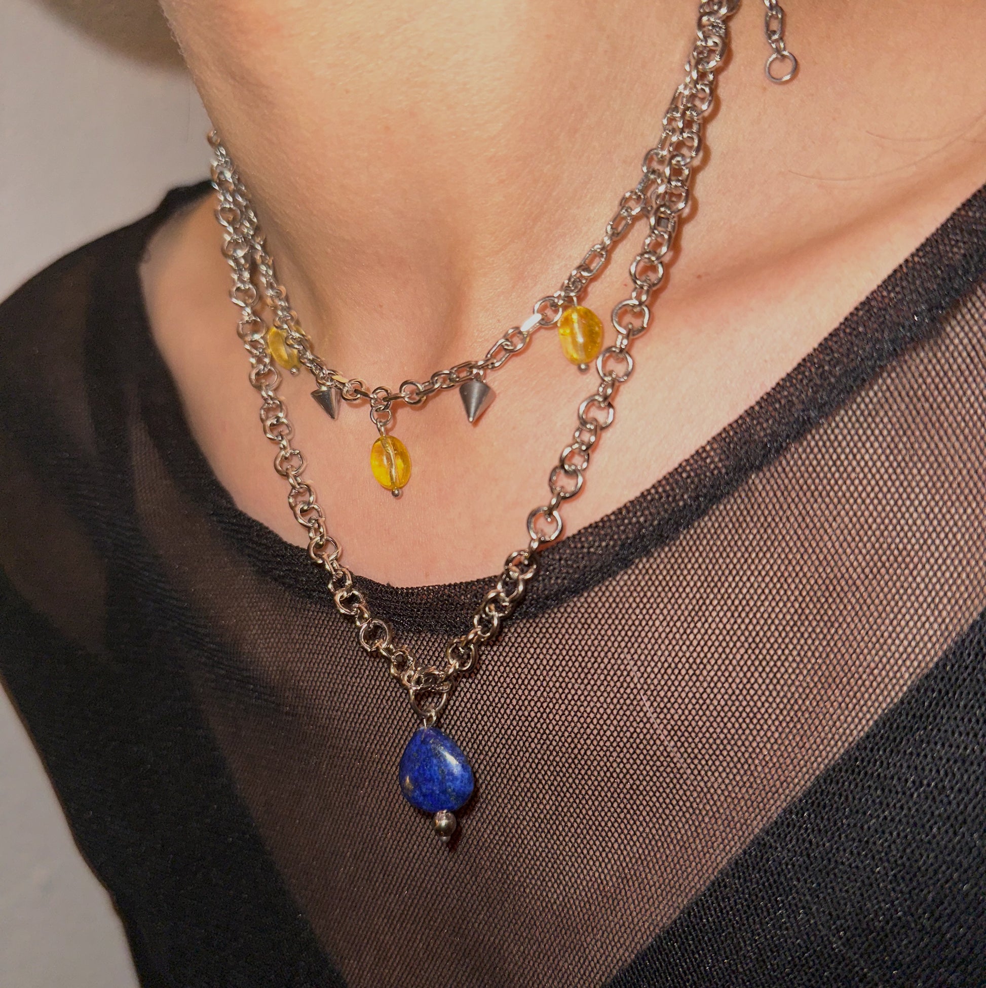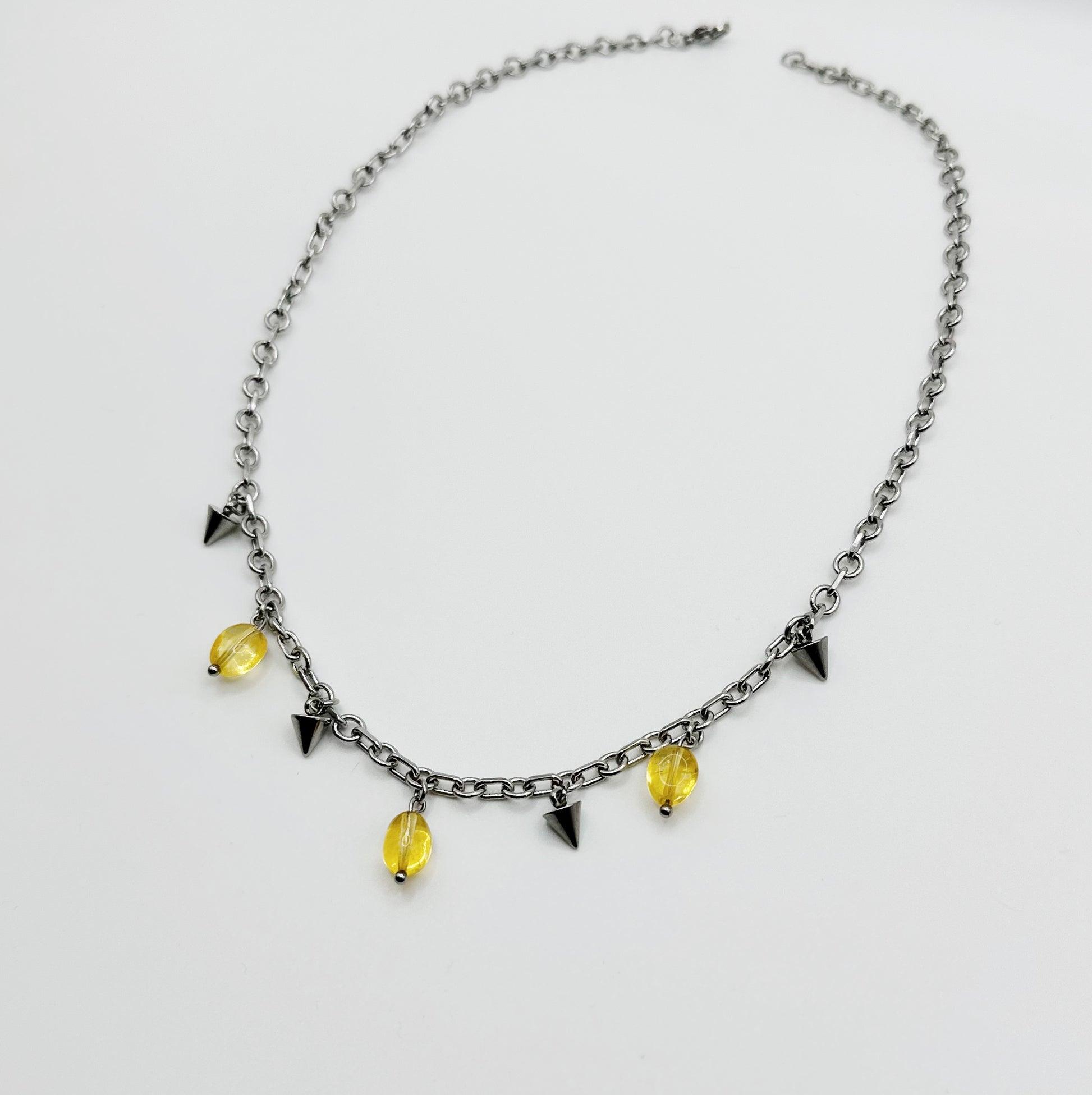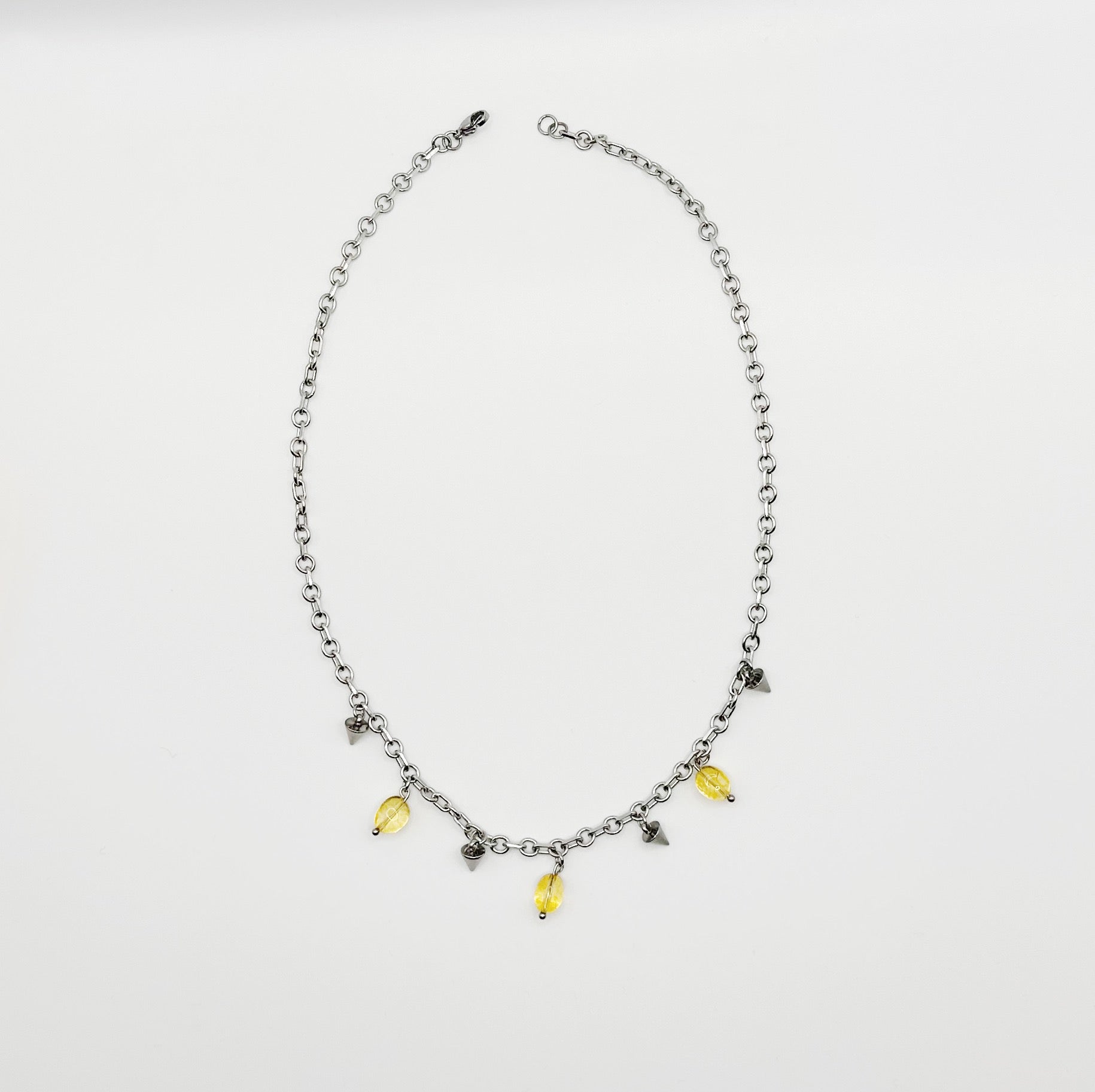 Collar de acero inoxidable y cuarzos. Mide 44 cm, lo puedes ajustar más chico tipo choker o más largo con su cadena de extensión.