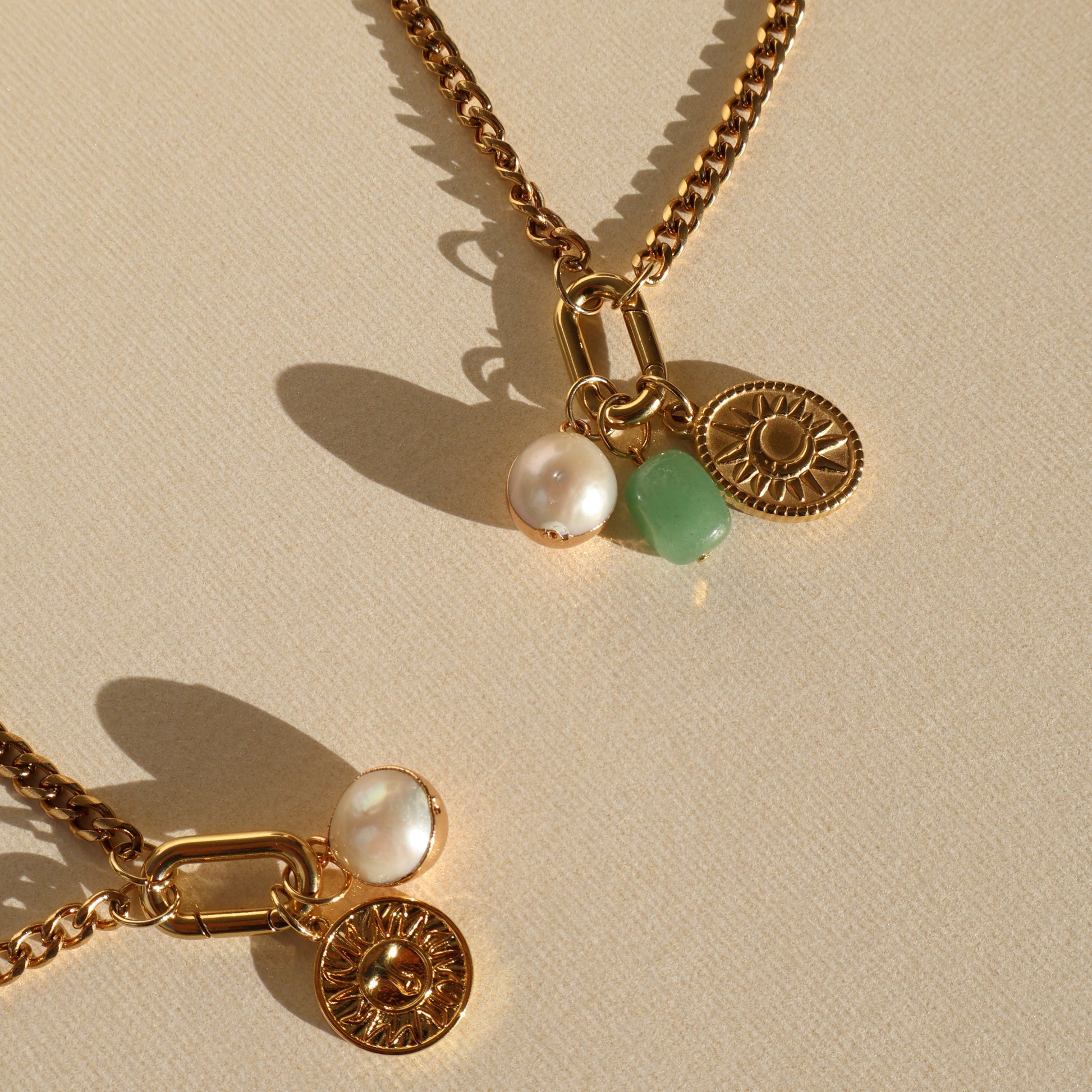 Collar de acero inoxidable con 4 dijes intercambiables (2 piedras, luna y sol). Diseño versátil que permite múltiples combinaciones. Mide 43 cm con cadena de extensión ajustable.