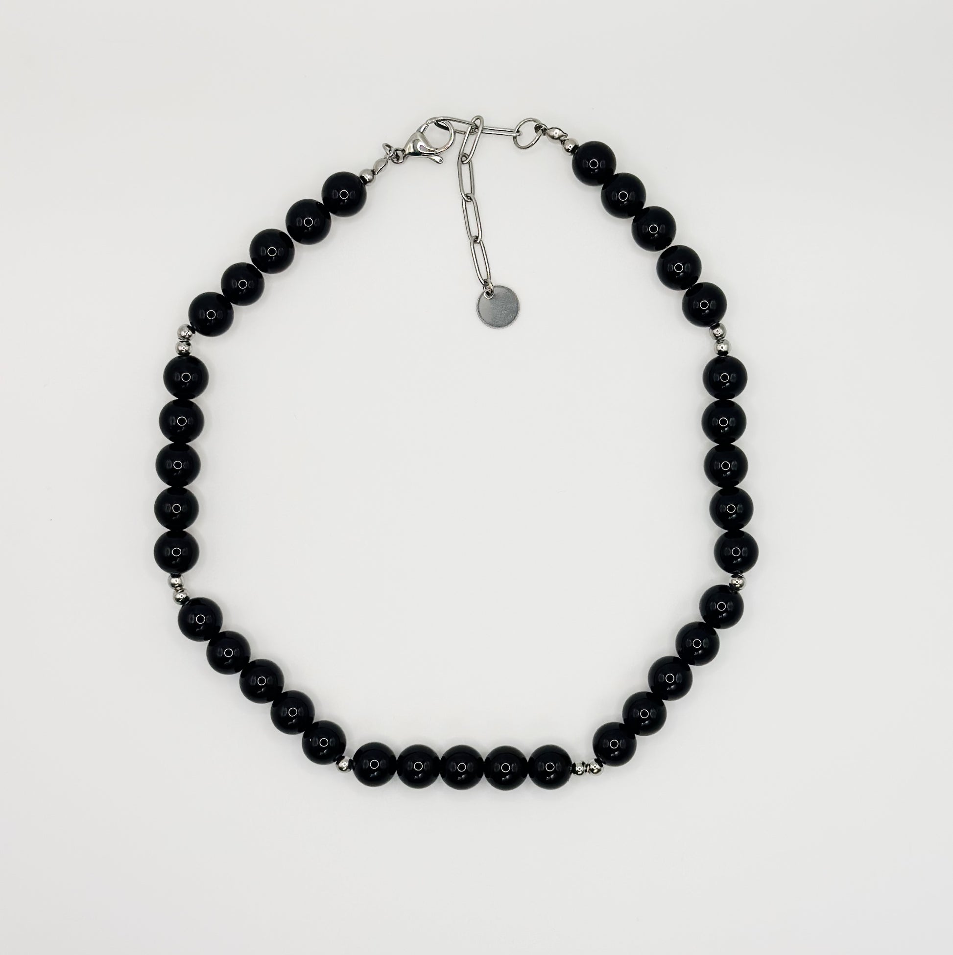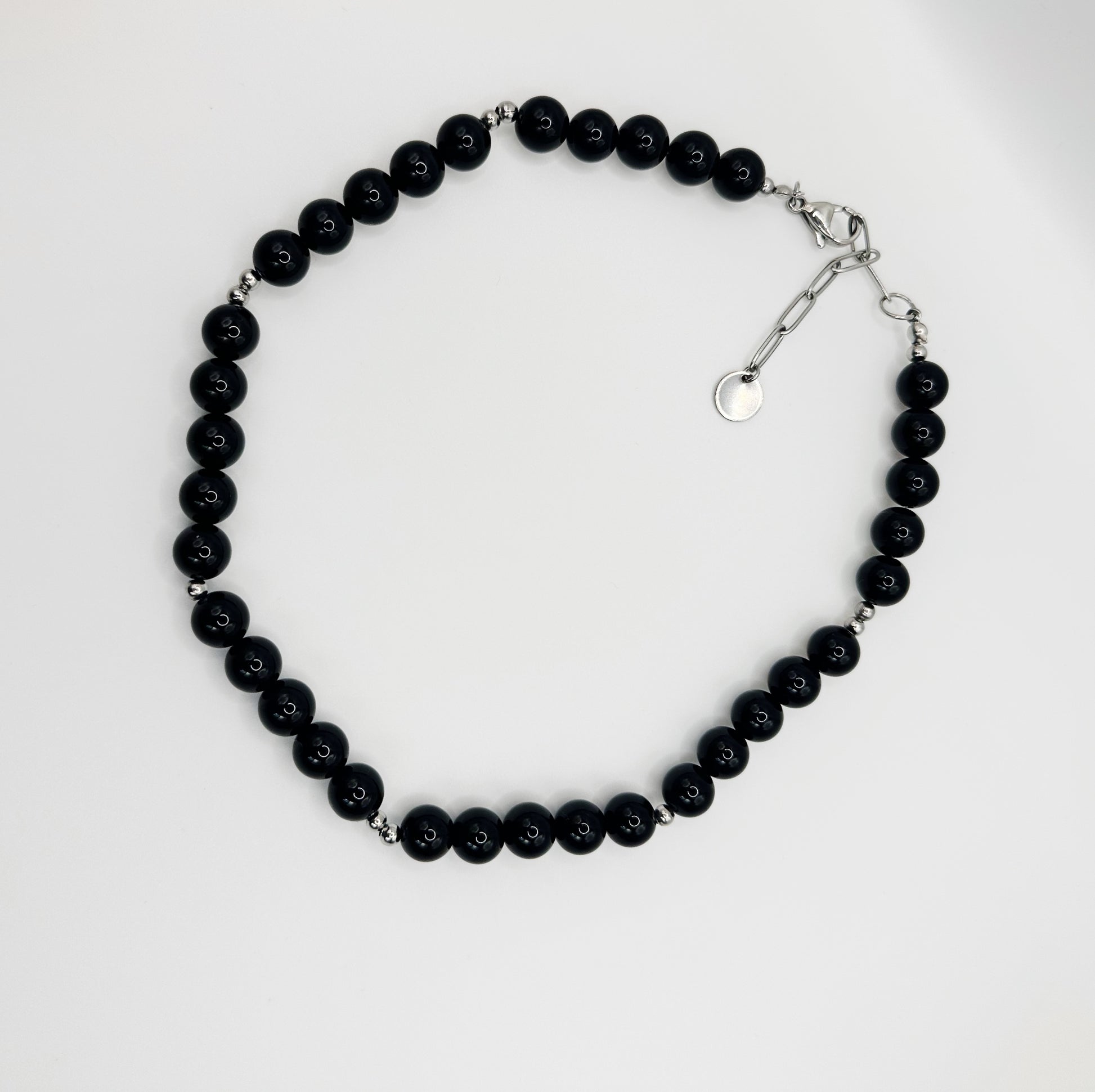 Collar de piedra onyx de 10 mm. Color negro intenso con broche y complementos de acero inoxidable. Mide 43 cm, lo puedes alargar con su cadena de extensión.