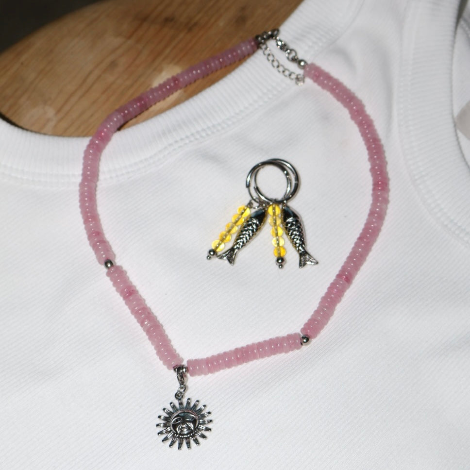 Collar de cuarzos naturales en tono rosa con dije de sol de acero inoxidable removible mediante broche. Mide 43 cm con cadena de extensión.