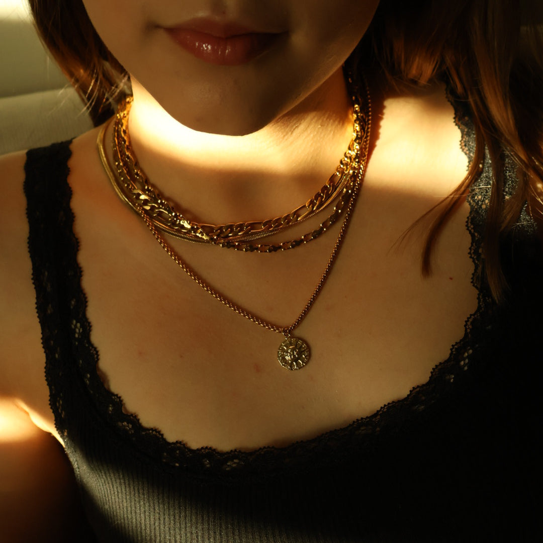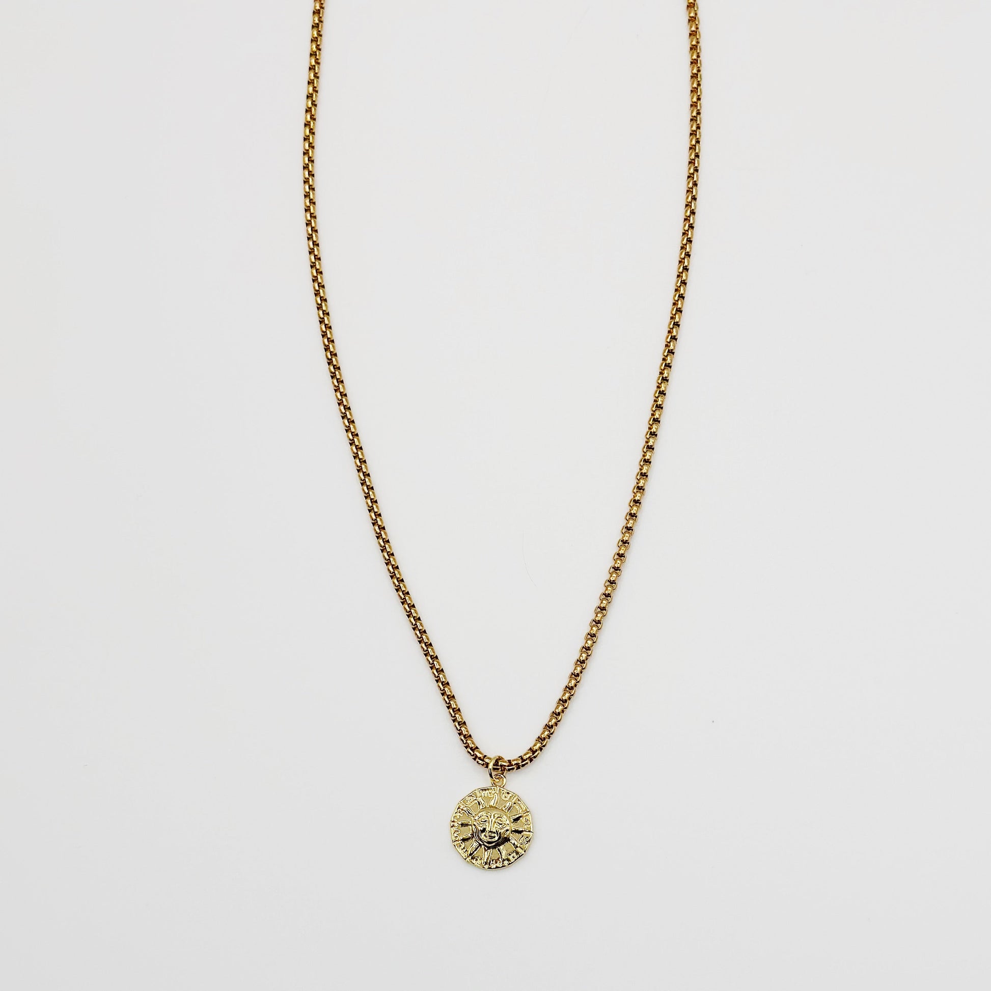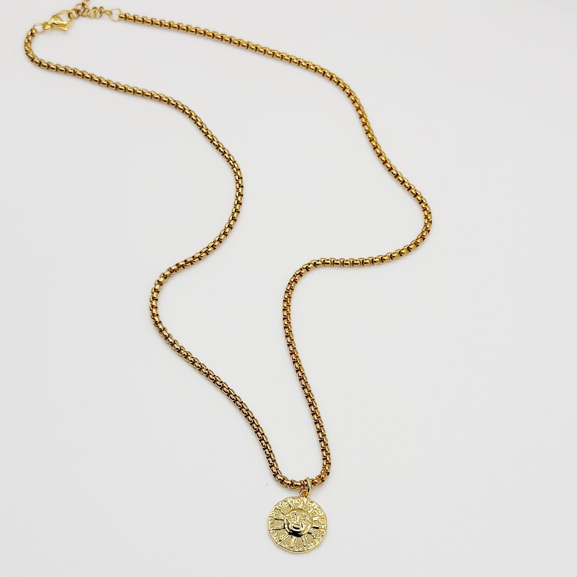 Collar de acero inoxidable, con dije tipo moneda de Sol. Encuéntralo en 2 medidas.