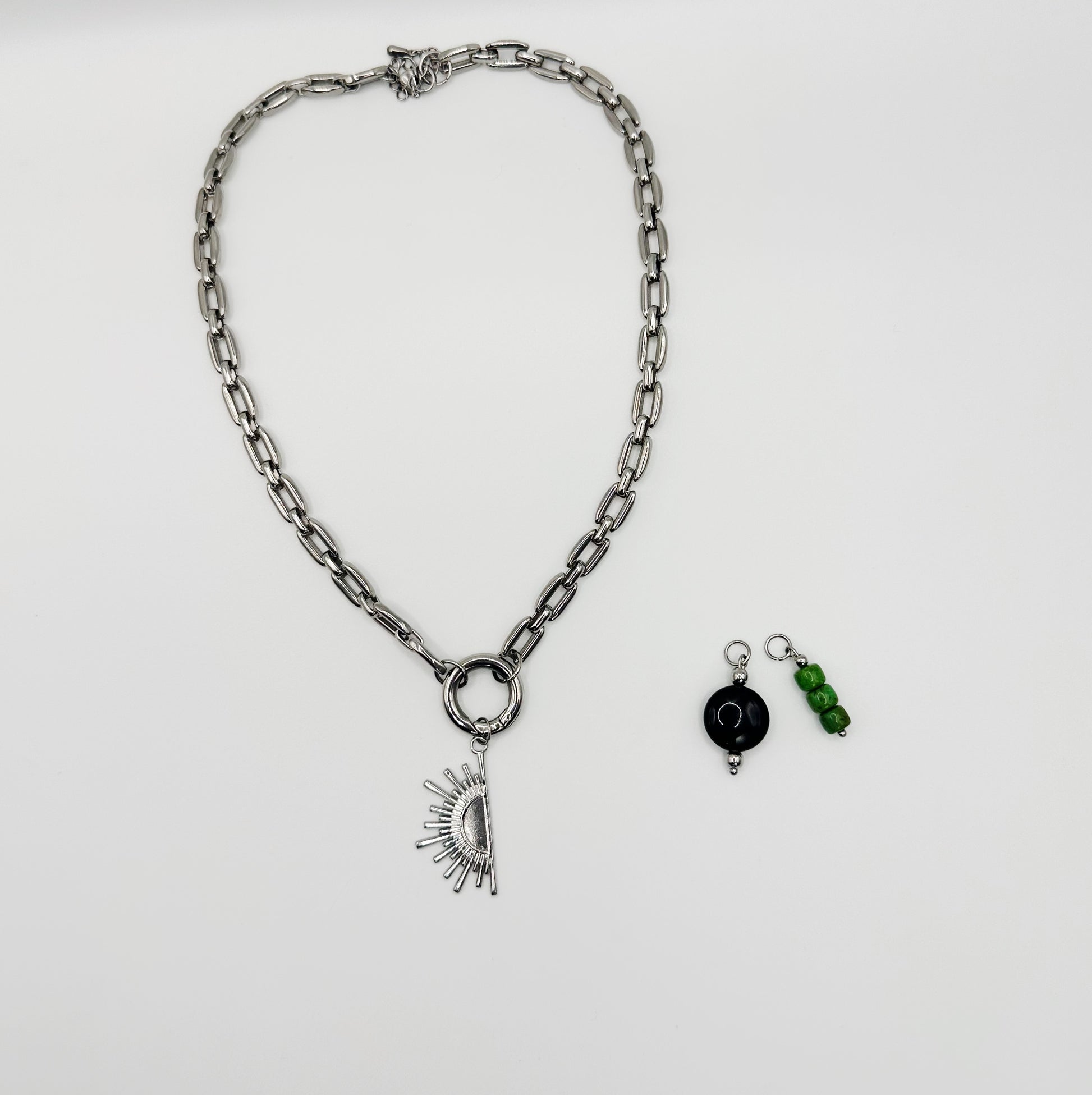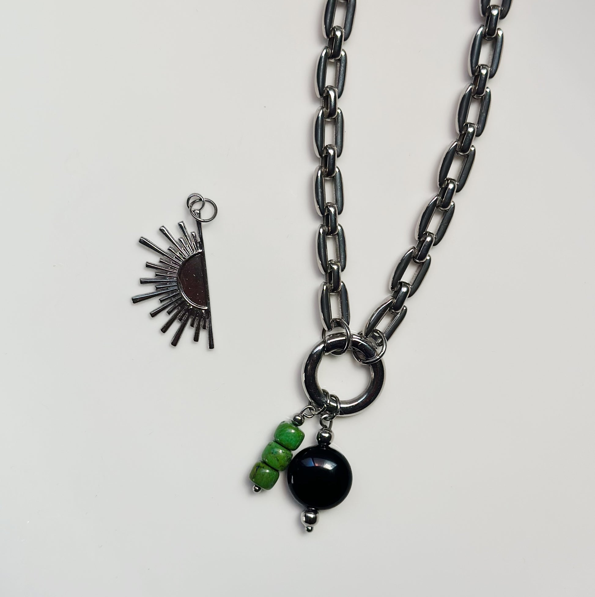 Cuarta edición del collar Talismanes que combina tres colgantes distintos: uno con símbolo de media luna y dos con piedras naturales de onix y turquesa verde. Todos los dijes son removibles para crear combinaciones personalizadas. Cadena de acero inoxidable resistente al agua. Mide 43 cm, puedes ajustarlo más corto por su tipo de eslabón.